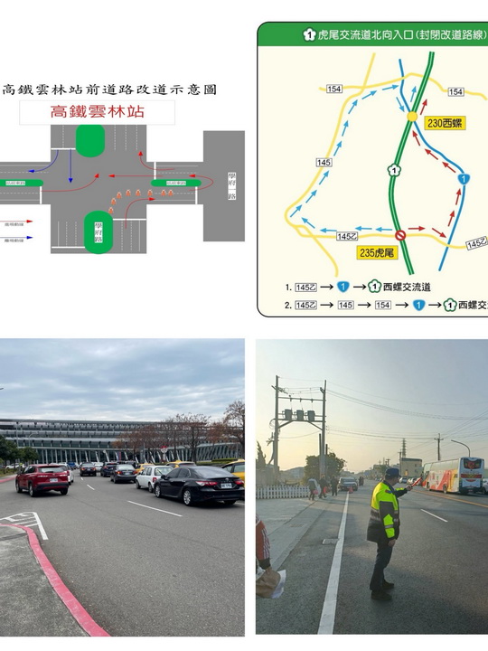 另連假期間部分時段高鐵雲林站前道路將規劃由學府路進入高鐵站之車輛強制右轉站前東路,再至學府一路口迴轉進入高鐵站以增加儲車空間,在此呼籲等候接送之車輛可多加利用高鐵站內停車場(停車30分鐘內免費),既方便又可節省尋找車位的時間。