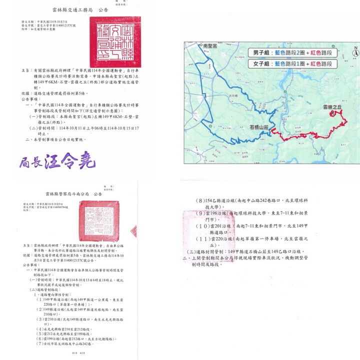 此案交通疏導管制時間及路段如下:一、 管制時間:中華民國114年10月13日6時起至是(13)日18時止,視比賽狀況提早或延後解除管制。二、 道路雙向彈性管制路段:(一)149甲縣道沿線(西起149甲縣道一公里處,東至雲220路口[草嶺第一停車場])。(二)149縣道沿線(北起雲149甲縣道共線起點,南至雲210路口)。(三)雲210沿線(北起149縣道路口,南至永光光興路路口)。(四)永光光興路雲210至雲212路段。(五)雲212永光光興路至雲199路段