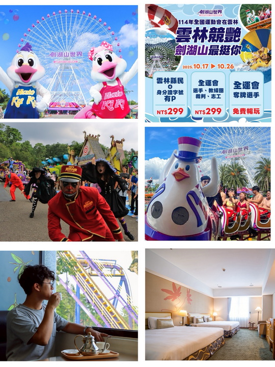 趁著全運會期間和萬聖派對的熱潮,把握超值優惠,到劍湖山世界瘋玩國際級遊樂設施、品嘗「招牌冠軍咖啡」、大啖美食、入住五星飯店,一起來High翻雲林!