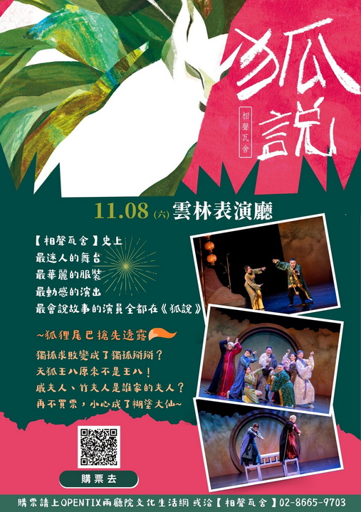 【大報新聞記者李婉愉/雲林報導】台灣知名相聲劇團「相聲瓦舍」將於 2025 年 11 月 8 日(星期六)下午 2 點 30 分,在雲林表演廳帶來全新創作劇目《狐說》。此劇為相聲瓦舍的 2025 年全台巡演作品之一,設計恢弘並融入劇場化演出元素,預計為雲林地區觀眾帶來一場兼具幽默、驚奇與反思的表演體驗。