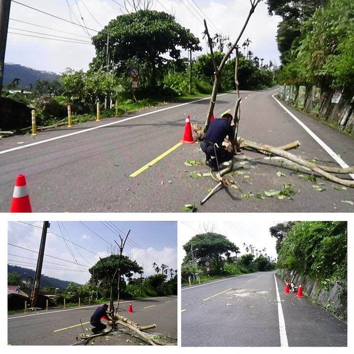 黃員見狀後,立即停車查看情況,考量該路段為山區蜿蜒道路,視線不佳,若不及時排除,恐造成往來車輛閃避不及引發事故。遂取出巡邏車上備用的鋸具,將倒伏枯木鋸成小段後搬移至路旁,迅速恢復道路暢通,確保用路人行車安全。