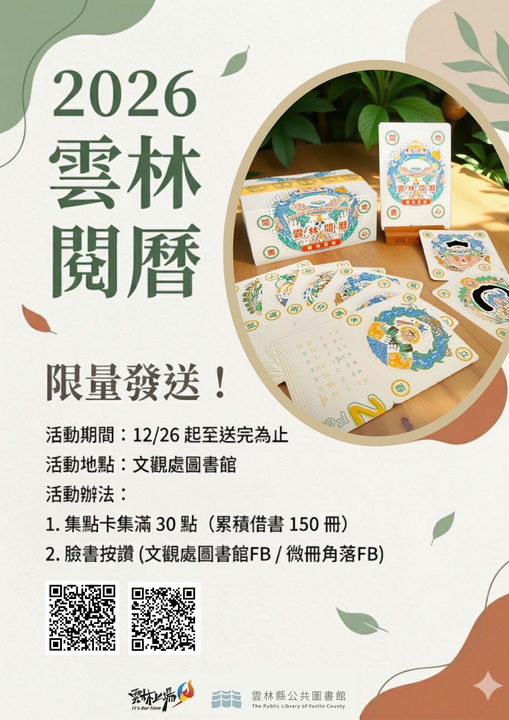 文觀處圖書館強調,2026《雲林閱曆》延續「限量、非賣品」策略,專屬回饋長期支持文觀處圖書館的讀者,12月26日起,只需集滿閱讀集點卡 30 點(累積借閱 150 冊),並完成臉書追蹤按讚,即可兌換。數量有限,換完為止,歡迎讀者趕緊來文觀處圖書館借書、累積點數,將這份最具文化溫度的年度典藏品帶回家。
