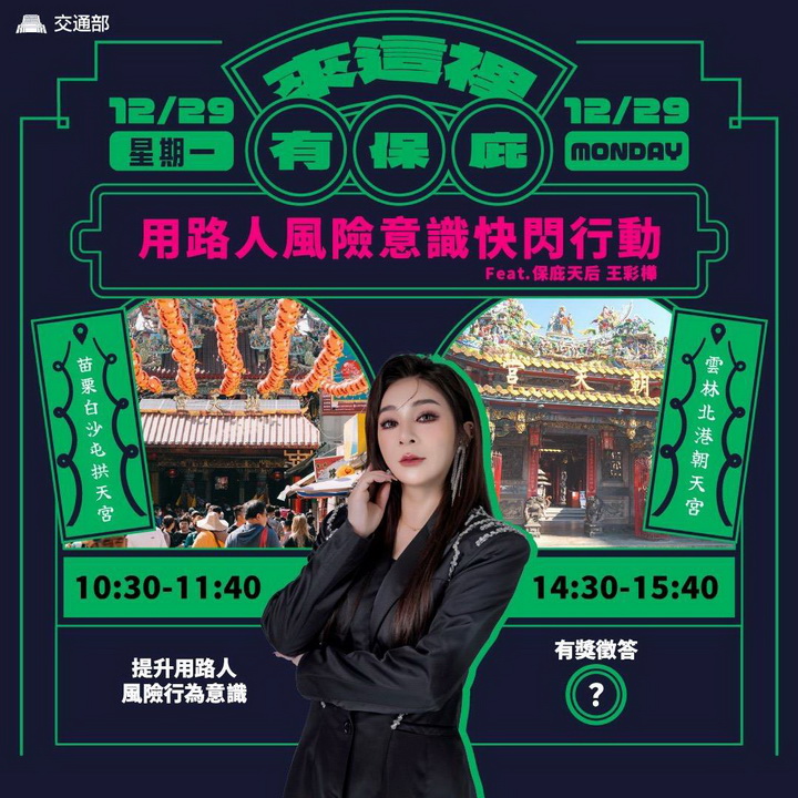 此次活動邀請「保庇天后」王彩樺擔任宣導大使,於北港朝天宮辦理用路安全宣導快閃活動,期盼透過寓教於樂的方式,提醒民眾守法用路、避險而行,讓每一趟出門都能平安回家。