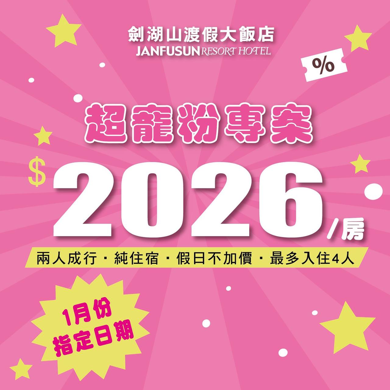曾慶欑總經理再表示,迎接2026年劍湖山渡假大飯店也推出「超寵粉專案」,1月份指定日住宿優惠,兩人成行純住宿只要2026元,指定日包含1月1、2、3、10、19、26、27、29日,歡迎民眾帶著家人、朋友一起來劍湖山渡假放鬆,漫遊雲林,更多活動資訊,都在劍湖山世界官方網站。