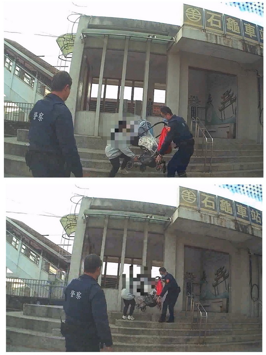 【大報新聞記者李婉愉/雲林報導】一名年約三十歲印尼籍女子日前推著載有1個多月的男嬰的嬰兒車,準備由石龜火車站出站,因出站時需通過一長排的階梯,無法將嬰兒車自行搬下,以致女子站在階梯前不知無措,斗南分局四維建國所所長黃建智與警員鄒駿莛巡邏經過時發現該情形,立即上前關懷並協助女子將嬰兒車安全搬下階梯。