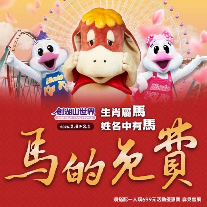 劍湖山世界總經理曾慶欑表示,為響應馬年意象,劍湖山世界於 2 月 6 日至 3 月 1 日推出「馬」的免費!生肖、姓名專屬限定優惠:免費入園:凡姓「馬」、生肖屬「馬」或名字中有「馬」部首的民眾,出示證件並搭配一名購買 699 元門票之親友,本人即可享有「免費」入園。