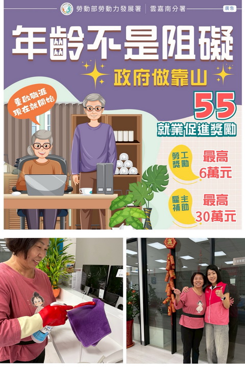 「五五就業促進獎勵」為中高齡打造舞台,為因應高齡化與勞動力短缺現象,勞動部推動「五五就業促進獎勵」,鼓勵年滿55歲以上,或45歲以上依法退休者重返職場。