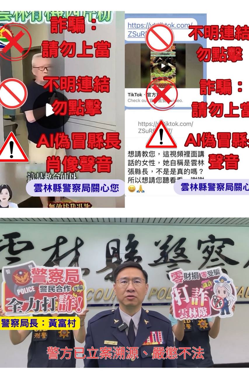 雲林縣警察局指出,縣長張麗善本人從未代言上述產品,亦未授權任何平臺使用其聲紋與影像進行商業行為,呼籲民眾鄉親切勿上當受騙。