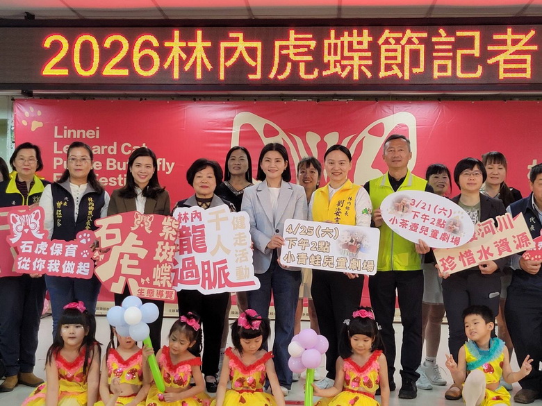 【大報新聞記者陳奕瑋/雲林報導】為推廣生態保育理念、深化環境教育並展現雲林淺山生態之美,2026林內虎蝶節今(12)日舉行宣傳記者會,在林內鄉立幼兒園小朋友熱情舞蹈表演揭開序幕。活動由虎蝶節吉祥物「虎寶」與濁水溪好夥伴「卓水蜥」偕同現場貴賓共同啟動儀式,宣告年度生態盛事正式啟航。