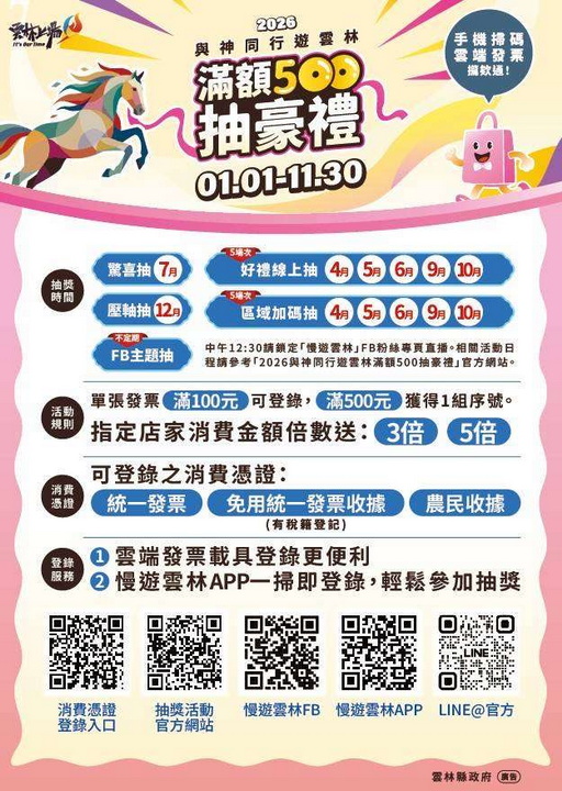 此外,「2026與神同行遊雲林滿額500抽好禮」活動自即日起至11月30日持續辦理,民眾於縣內消費累計每滿500元即可獲得1組抽獎序號,累積越多,中獎機會越高。透過階段性、多節點的抽獎規劃,不僅延長活動熱度,也有效帶動消費循環。首場「線上抽好禮」將於4月15日登場,獎項包含iPhone手機、現金獎、通路禮券及雲林特色伴手禮等,內容豐富多元。