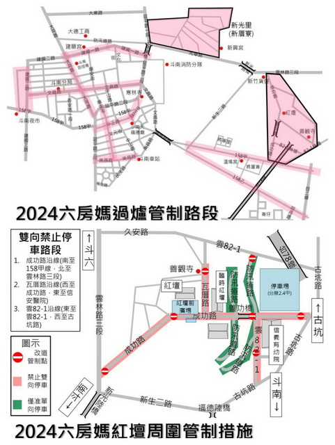三、 管制範圍區分: (一)斗南鎮古坑路(158甲線),新生二路路口至台三線路口沿線。 (二)斗南鎮永光路(158乙線),新生二路路口至台三線路口沿線。 (三)斗南鎮中山路,延平路二段路口至南昌路路口沿線。 (四)斗南鎮中正路。沿線。 (五)斗南鎮南昌路沿線。 (六)斗南鎮建國一路、建國二路沿線。 (七)大同路,大業路路口至延平路二段路口沿線。 (八)斗南鎮文昌路沿線。三、 場所管制部分:(一) 建順宮(雲林縣斗南鎮建國一路276號):含周邊道路【範圉:北起建國一路、南至文昌路、東起延平路二段、西至大同路】。(二) 新興宮(雲林縣斗南鎮光聖路62號):含周邊道路【範圉:北起光興路、南至光華路、東起延平路一段、西至光聖路】。(三) 斗南股烏瓦磘紅壇(雲林縣斗南鎮成功路38號):含周邊道路【範圉:北起雲林路三段、南至古坑路、東起雲81線、西至古坑路】。活動期間在紅壇會場周遭設交通管制點,當會場區停車空間滿時,將於路口管制車輛進入(住戶辨證通行、機車除外)。