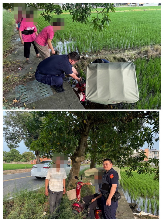 員警趕赴現場,該名沈姓老翁已由路過民眾將其從田裡救出,經警方初步檢查,老翁身體並無明顯外傷,但老翁所騎乘之電動代步車因車體較重卡在土裡,警方與民眾合力將老翁的電動代步車從田裡搬上來,老翁向熱心民眾與員警頻頻道謝。