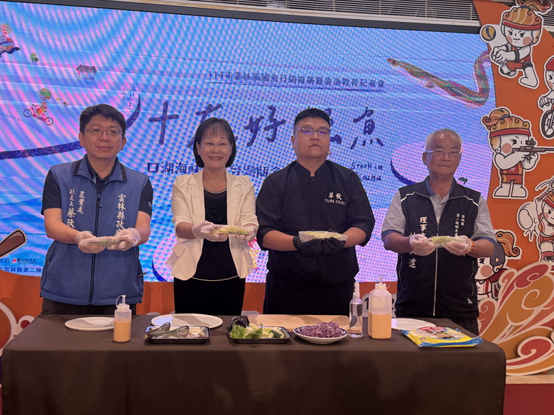 【大報新聞記者陳奕瑋/雲林報導】為推廣台灣在地鰻魚產業,並將口湖地方特色與漁村文化傳遞給大眾,雲林縣政府與雲林縣第二鰻蝦生產合作社今(22)日在縣府親民大廳舉辦鰻魚行銷推廣暨食魚教育記者會,副縣長謝淑亞、雲林縣第二鰻蝦生產合作社理事主席林欲達、縣府農業處副處長蔡耿宇、台灣版食通信執行長楊燦如、口湖鄉農會總幹事呂惠玲、縣議員陳芳盈助理陳宜盈、縣議員陳永修秘書陳盈儒等人共同邀請民眾多食用鰻魚,既健康又能替漁民打氣。